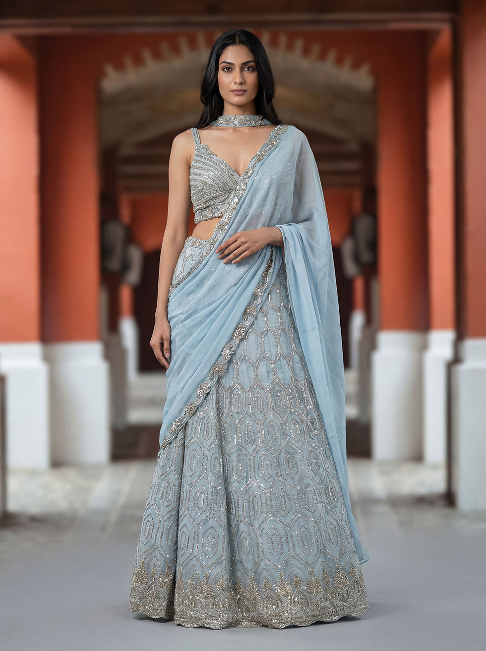 Drape Saree - Saree, Jacket & Belt Set - Sea Green.